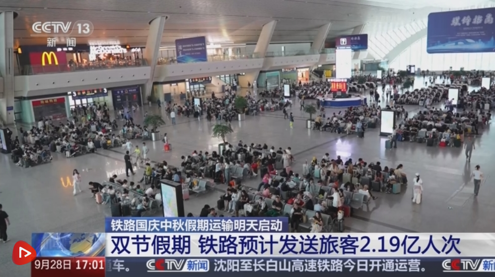 CCTV新闻:来自中国铁路集团的记者发现,在国庆日和中期音乐节期间铁路的运输将于9月29日开始,并于10月10日结束12天。预计国家铁路将派遣2.19亿乘客。乘客流量的最高高峰将于10月1日举行,平均日程安排近13,000列客车。