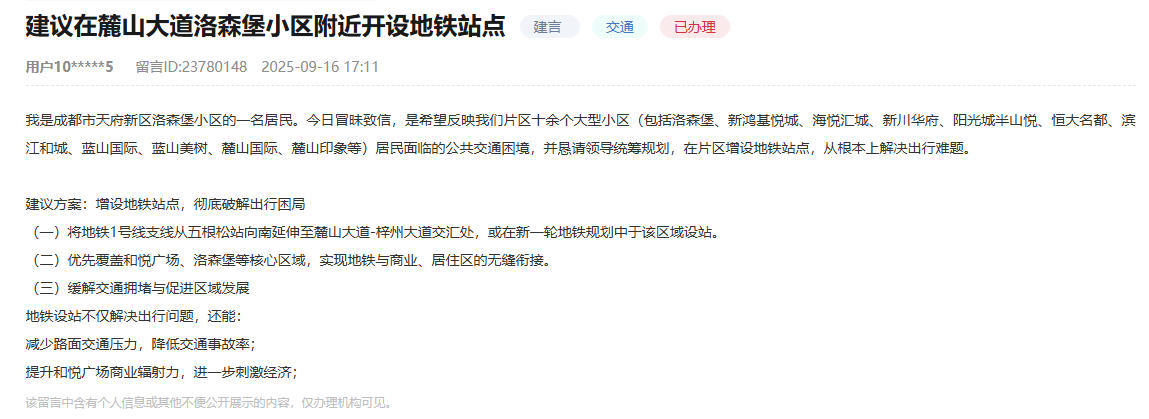 人民网成都10月16日电(罗宇)近日,有成都网友在人民网“留言板”留言称,辖区十余个大型社区的居民面临公共交通困难。对此,四川天府新区公园城市建设局回应称,区内已规划3条地铁线路。每日在线“排行榜”上网友留言截图。留言中,该网友希望解决出行困境,提出三点建议:1、将地铁1号线支线从五根松站向南延伸至庐山大道与子洲大道交叉口,或在新一轮地铁规划中在此区域设置车站; 2、欣赏图拉德和悦广场、罗森博格等主要区域的覆盖,实现地铁与商住的无缝连接; 3、网友认为设置地铁站的开通不仅能缓解出行问题、减轻道路交通压力,还能增强和悦广场的商业辐射力,进一步拉动经济。每日在线“领导板”官方回应截图。收到消息后,四川天府新区公园城市建设局调查并回应称,根据《成都市城市轨道交通线网规划》(2021年版),15号线、21号线、29号线规划在该网友咨询的区域附近。其中,15号线规划连接双流机场东、西区、华阳、新川科技园; 21号线规划连接天府新区与双流东升新城; 29号线规划连接老城区西部、西南、南部高新区和天府新区。目前,上述线路均处于网络规划阶段,线路规划尚未稳定。鳍以批准文件为准。回复还提到,下一阶段,四川天府新区公园城市建设局将全力配合市有关部门,根据城市规划、客流需求、工程条件、铁路区域布局等因素,对相关规划线路近期建设的必要性和约束条件进行深入研究,以供有关部门决策。同时,为满足片区近期交通需求,该局表示,将积极会同有关部门,完成慢行系统、常规公交和开行列车线路之间的衔接换乘工作,更好地服务片区广大群众。 Copyright © 2024-2026 17ccgcg吃瓜网黑料爆料蘑菇视频-17c黑料爆料视频在线看免费版在线看 版权所有